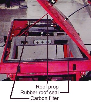 Remove the rubber strap from over the top of the carbon filter and remove it from its frame. Place it in a plastic bag and dispose of properly. When fitting the replacement filter ensure that the rubber seal around the filter is located correctly to avoid contaminated air being pulled in past the filter.