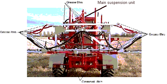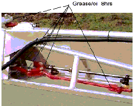 each yoke of the PTO shaft (if fitted) and a grease point on each end