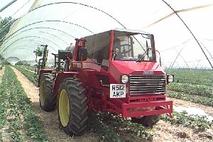 A completly new innovation from the Frazier factory. This machine has been developed to work in "Spanish" tunnels for a large soft fruit grower. The design of this machine had to cope with the height and curvature of the polythene tunnels,so we designed and constructed a new cab to give a maximum height of 2.1 metres on 12 x 28 wheels.The cab was also moved forward to give a new low driving position and more glazed areas were introduced to improve visability. The basic chassis remains the same, based on a Phantom 4W/S to give the maximum manoevrability needed for working in the tunnels. The machine has now been fitted with a special air blast sprayer to suit the customers needs. A front mounted hydraulic parallel linkage has also been developed to carry a small inter-row sprayer This project proved once again that we can offer almost any adaption to our range of machines and we hope to do more in the future.