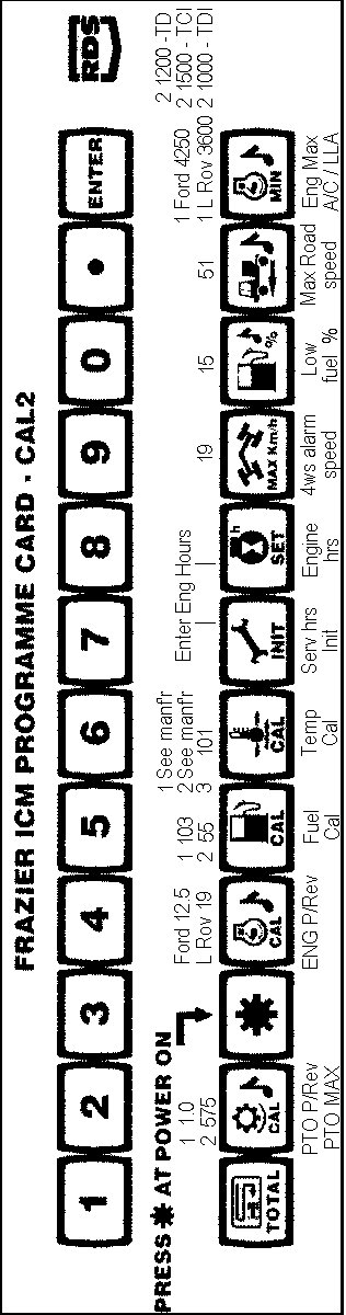 4 Temp guage calibration 5 Service hours initialisation - Enter same as recorded engine hours. 6 Engine hours - Enter previously recorded engine hours 7 4ws alarm speed = 19 8 Low fuel warning level = 15% 9 Maximum road speed alarm = 51