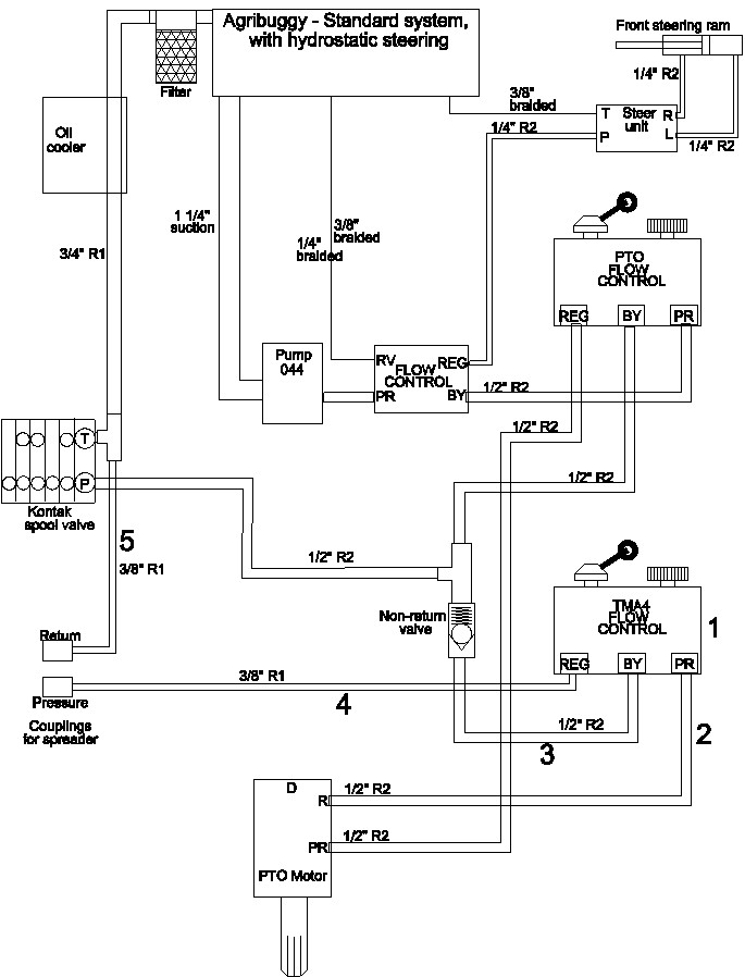 This kit is suitable for fitting to most Agribuggies with standard piping systems fitted. It provides an auxiliary oil flow which is controlable from the cab to drive the metering rollers on a TMA4 spreader. It is not suitable for driving other types of spreader. The kit only contains the components for the Agribuggy side of the system. A seperate kit is available to convert land wheel driven TMA4s to hydraulic drive.